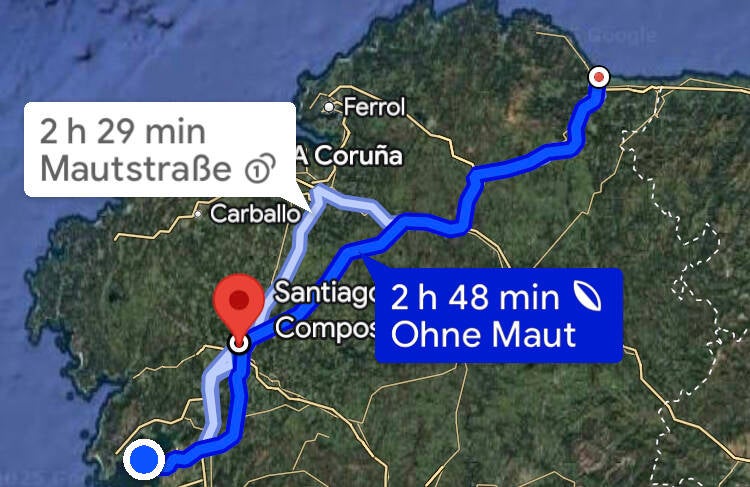 Es sind über 600 km abzufahren, deshalb der frühe Start. Nach Sonnenaufgang fuhr ich entlang der steil abfallenden Küste von Galizien und hatte eine wunderbare Sicht auf den Atlantik. Gebremst wurde ich durch das Laden meines Jaguars, denn in Spanien sind wieder andere Apps von Nöten. Ich habe aber genug Reserve eingerechnet, es sollte reichen. Nicht dass mich noch die Flut einholt.