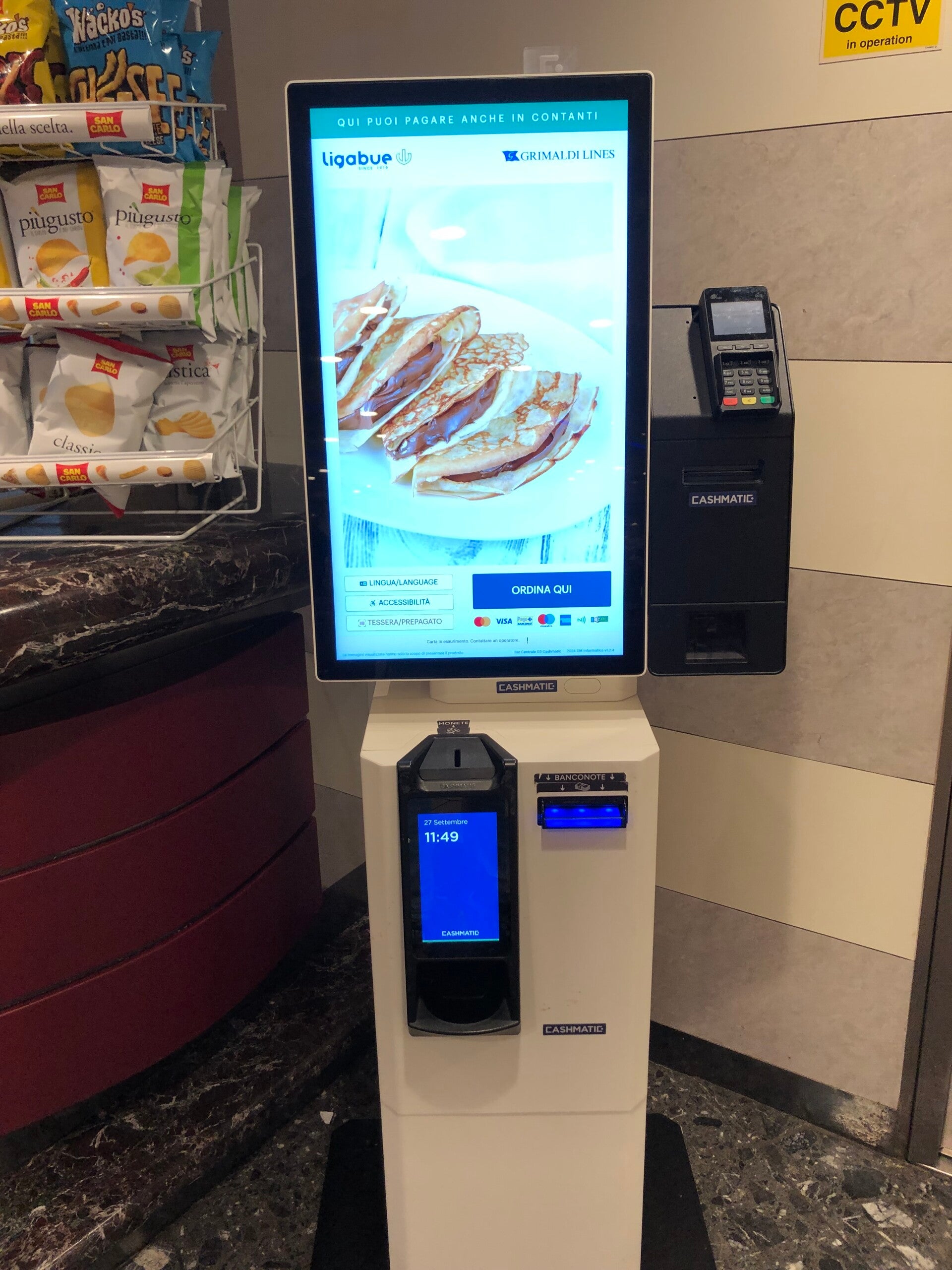 Bereits um 7 Uhr ging ich los und suchte eine Kaffeebar. Super, zwar wie bei Mc Donalds am Termnal das Frühstück zusammenstellen, aber ich war fast der einzige Gast. Der Barkeeper fragte dann aber doch noch, ob ich wirklich einen Coretto Grappa zum Frühstück wolle. Ups vertippt, cafe con leche tats auch🤣. Er hatte Zeit und machte mir einen frischen Orangensaft!
