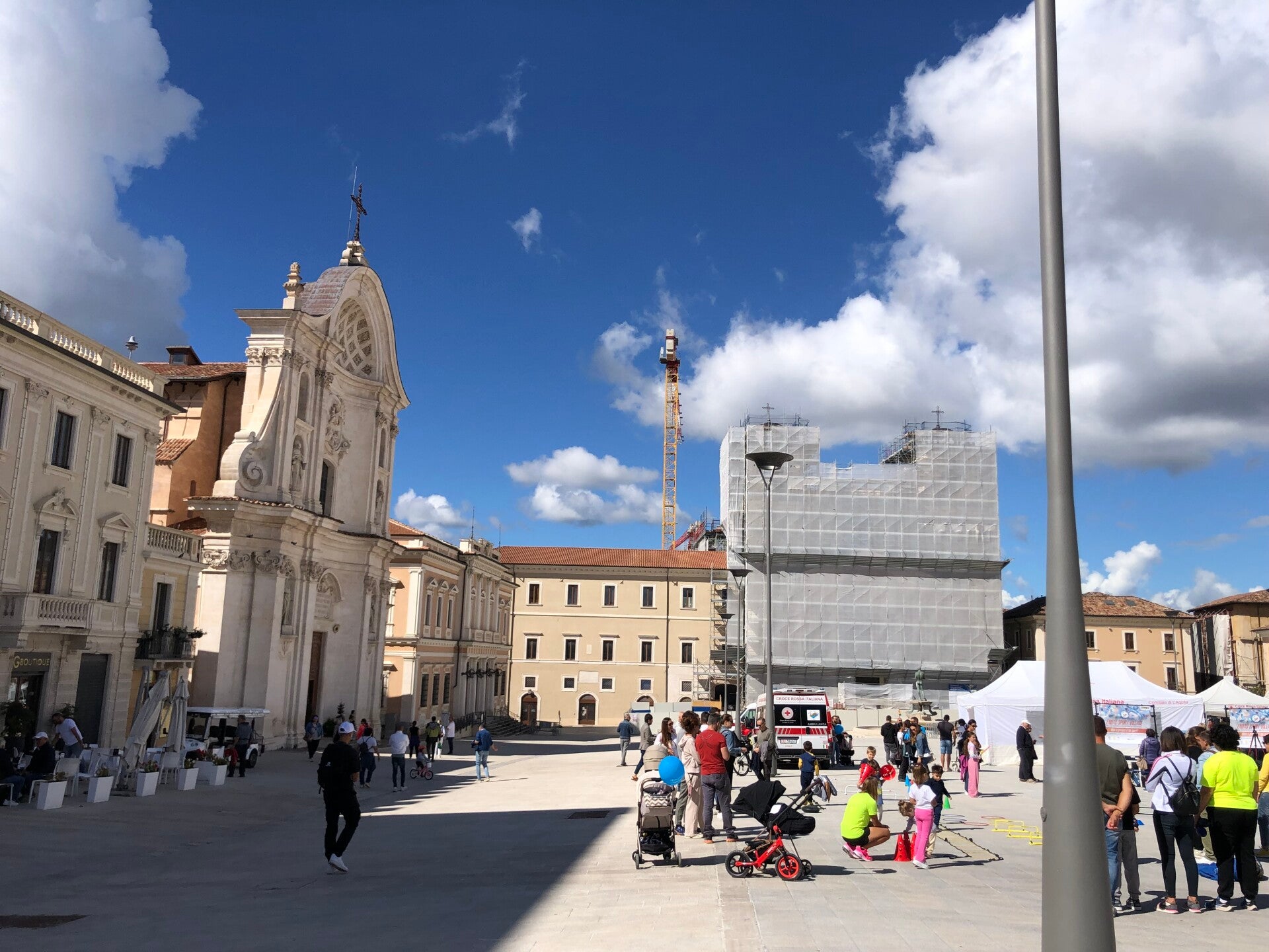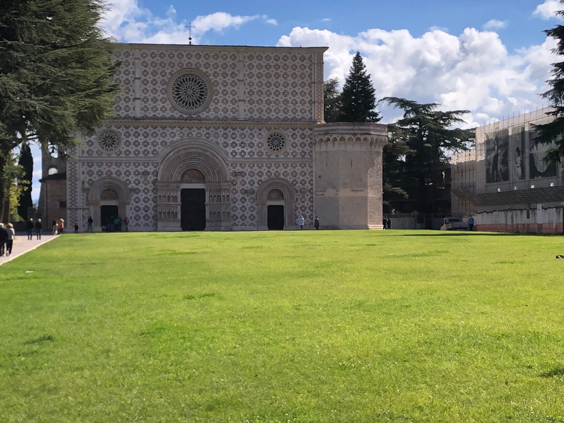 Nach der Fahrt über die Abruzzen komme ich gegen Mittag in die Stadt Aquilla. Ja da war doch dieses grosse Erdbeben 2012. Kirche, Ratshaus und die Bank wieder schön aufgebaut, auch sonst in der Innenstadt sieht es toll aus, doch bei der Fahrt durch die Stadt sind doch noch viele baufällige Häuser zu sehen.