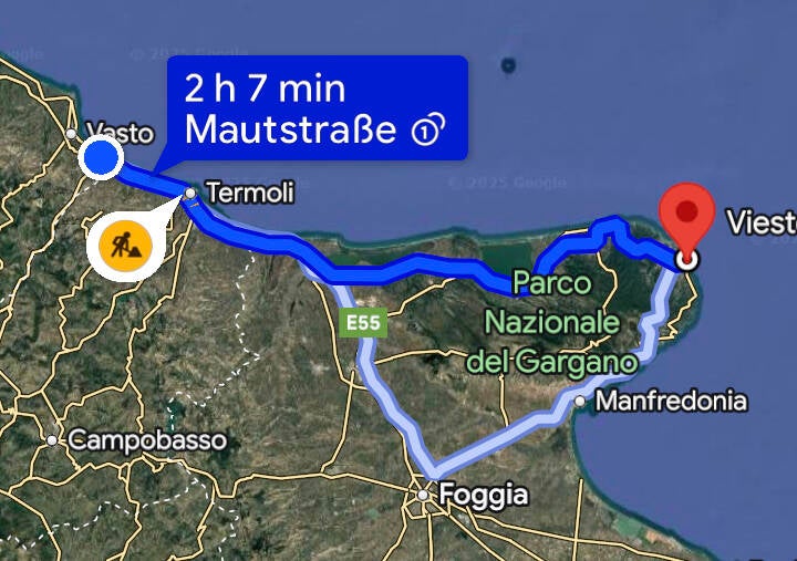 Ich fuhr weiter zu meinem Tagesziel in Vieste. Das Städchen liegt an der Spitze einer Halbinsel an der Adriaküste. Die Fahrt ging länger als gedacht, Serpentinen und ein auf und ab entlang der schönen Küste forderten Zeit und ich kam gerade beim Einbrechen der Dunkelheit imHotel Garden Ripa an.