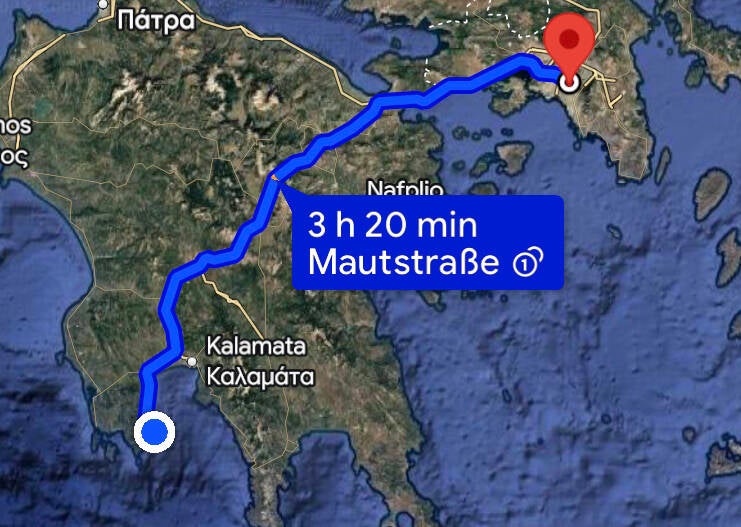 Die Zeit bis zu ihrer Ankunft nutzte ich, um ein neues App für das Laden in Griechenland herunterzuladen. Ich testete es frühmorgens und es klappte alles bestens. Kostas hatte uns den Kühlschrank gefüllt und alles für ein herrliches Frühstück bereitgestellt. So gestärkt und gerüstet fuhren wir dann los nach Koroni. Unterwegs null Probleme mit Energie! Kurzer Kaffeehalt am berühmten Kanal von Korinth.