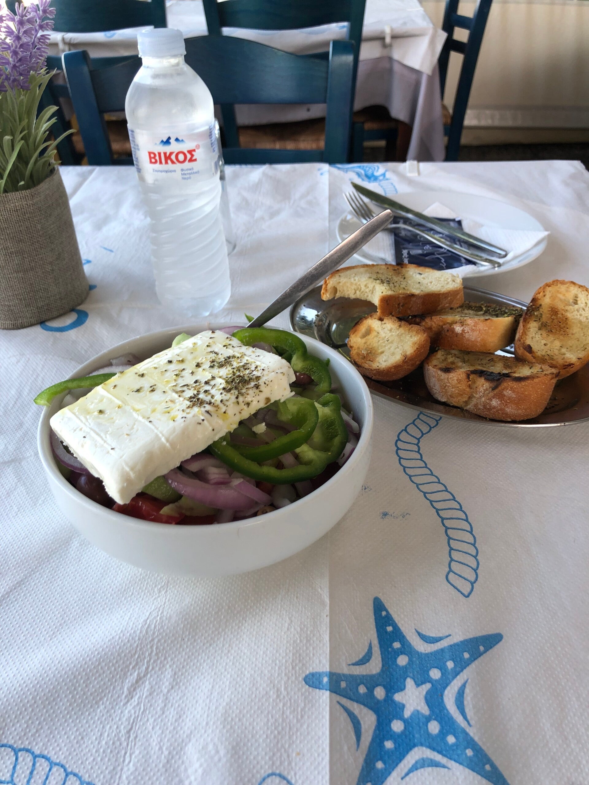 Natürlich den Griechischen Salat genossen bei einer Ladepause in der Nähe von Patras. Weil ich fragte, ob er mit Fetakäse sei, war das die Bestellung für noch zusätzlich einen gebratenen Käse🤣